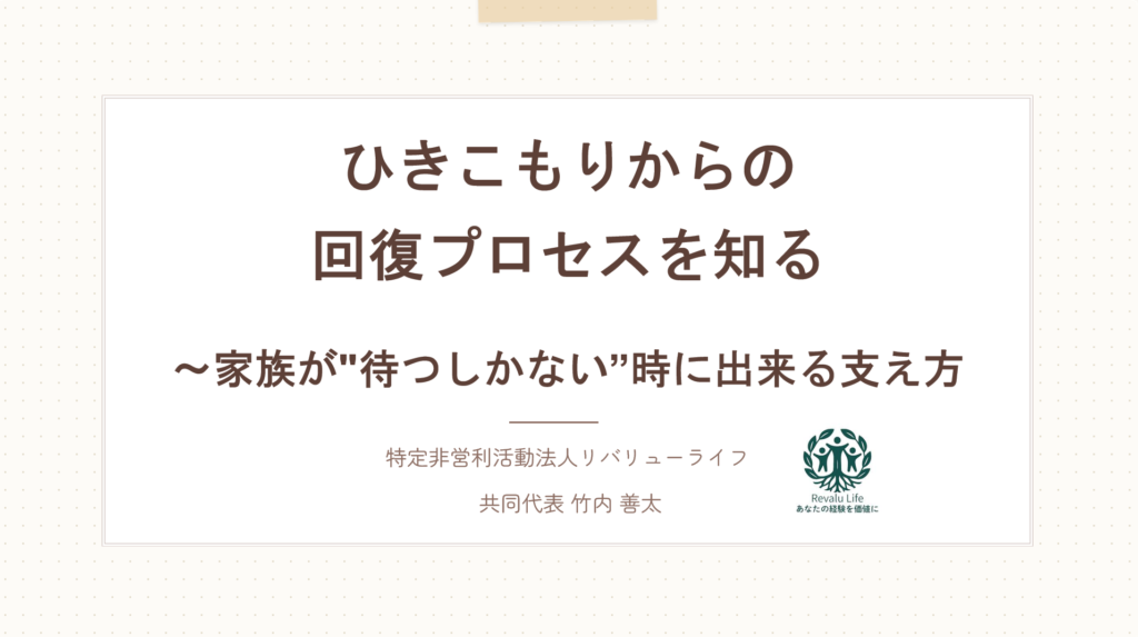 「ひきこもりからの回復プロセスを知る〜家族が待つしかないときにできる考え方〜」というテーマのもと、自身の体験と親としての視点の両面から、リカバリーへの道のりについてお話しさせていただきました。
